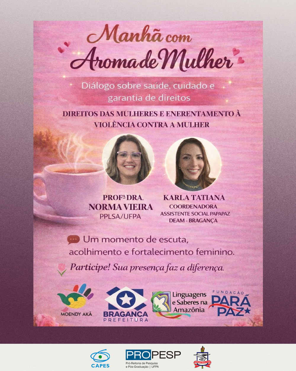 A Profa. Dra. Norma Cristina Vieira do PPLSA esteve na Manhã com Aroma de Mulher, dialogando sobre Direitos das Mulheres e Enfrentamento à Violência contra a Mulher, juntamente à coordenadora assistente social Karla Tatiana.